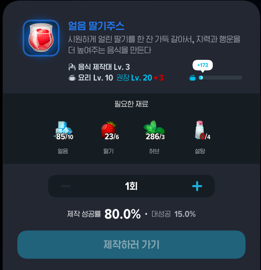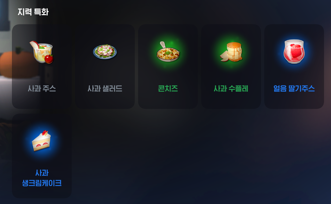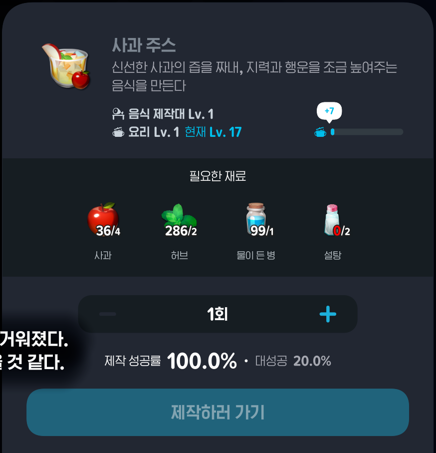 음식은 수련이 참 까다로운 종목이다. 하위 등급의 요리를 수련을 위해 만들자니 대부분 실사용이 불가능할 정도의 낮은 능력치 상승을 보여주고, 괜찮은 수준의 능력치 상승을 보이는 레어(파랑)이상 등급의 음식은 제작에 있어 재료 수급 난이도가 너무 높다. 이는 일부 재료를 식료품점 NPC를 통해 직접 구매해야하는 구조 때문이다. 구매 횟수 제한이 있어 주당 제작할 수 있는 음식이 제한되는 상황이다. 한마디로 정리하면, 만들어도 쓸 데 없고 경험치도 조금 주는 음식을 무제한 만들어서 랭크업 할 것이냐? 아니면 매주 조금씩 만들면서 기다릴 것이냐? 이다.